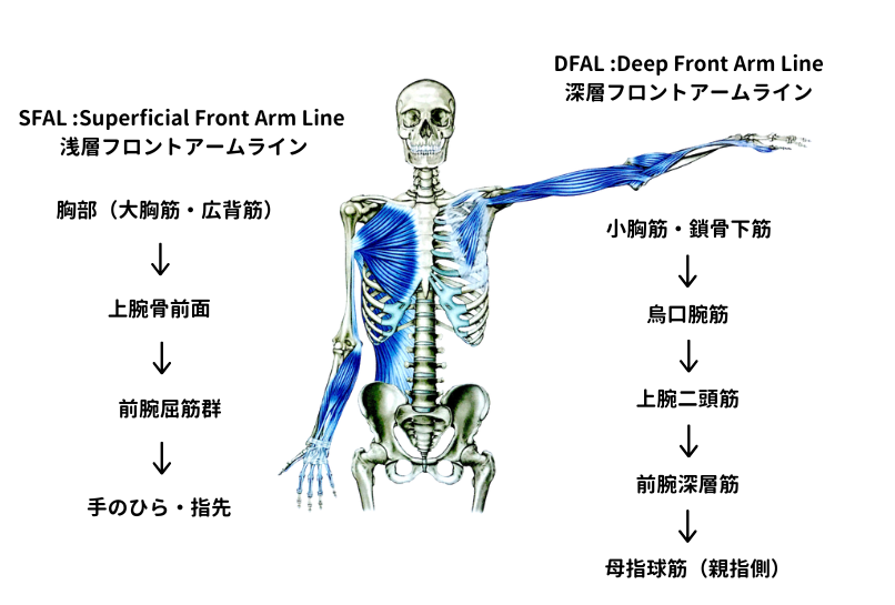 浅層フロントアームライン Superficial Front Arm Line (SFAL) 胸部→上腕前面→前腕屈筋群→手のひら・指先 大胸筋、上腕二頭筋、手根屈筋群