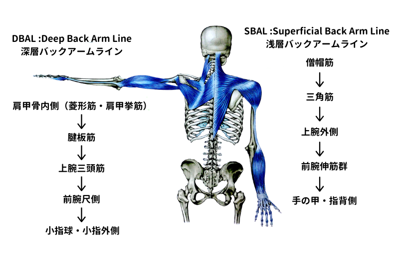 浅層バックアームライン Superficial Back Arm Line (SBAL) 僧帽筋→三角筋→前腕伸筋群→手の甲・指背側 僧帽筋、三角筋、前腕伸筋群